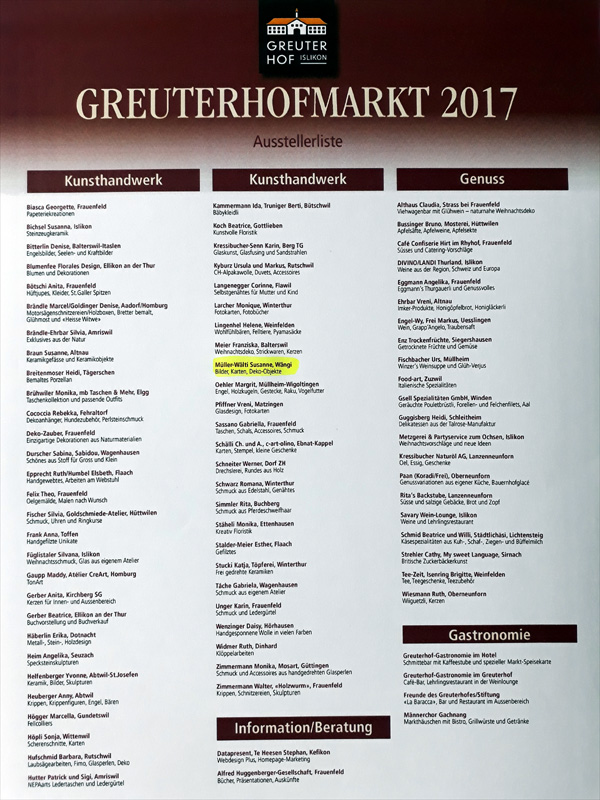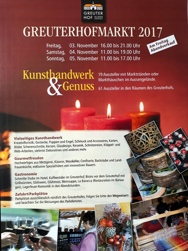 3. bis 5. November 2017 Greuterhofmarkt "Kunsthandwerk & Genuss" Islikon TG