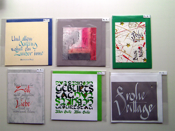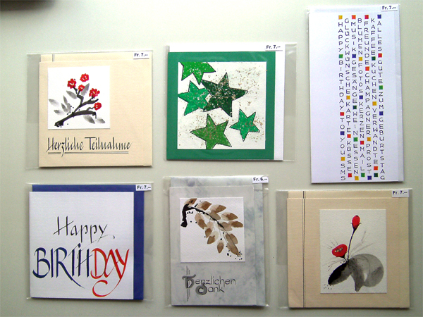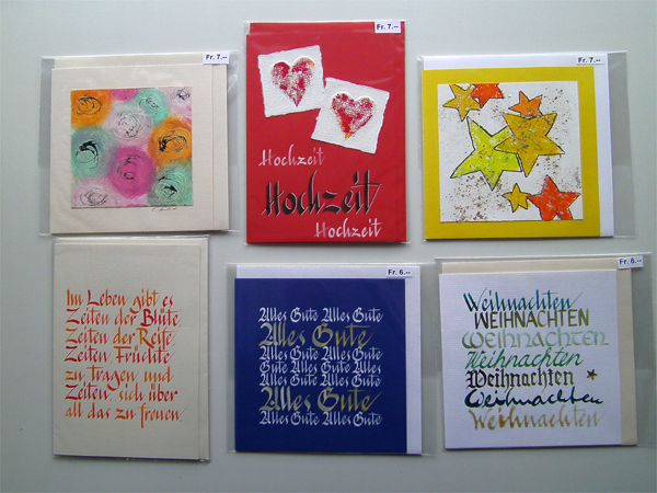 In den unten aufgeführten Karten-Kategorien finden Sie eine kleine Auswahl meiner Arbeiten, einen Querschnitt aus der Vielfalt individuell gestalteter Karten. Jede Karte ist von Hand geschrieben, also ein Unikat.